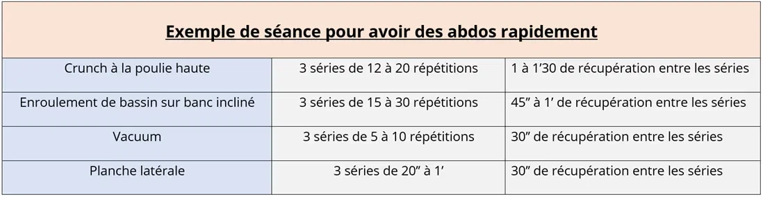 La recette idéale pour comment avoir des abdos rapidement semble globalement de pratiquer 2 exercices exerçant le grand droit dans son rôle de flexion du tronc en changeant d'angles d’attaque (comme les crunches sur swissball et les enroulements de bassin au sol, par exemple) ainsi qu'un exercice destiné au transverse ainsi qu’aux obliques.